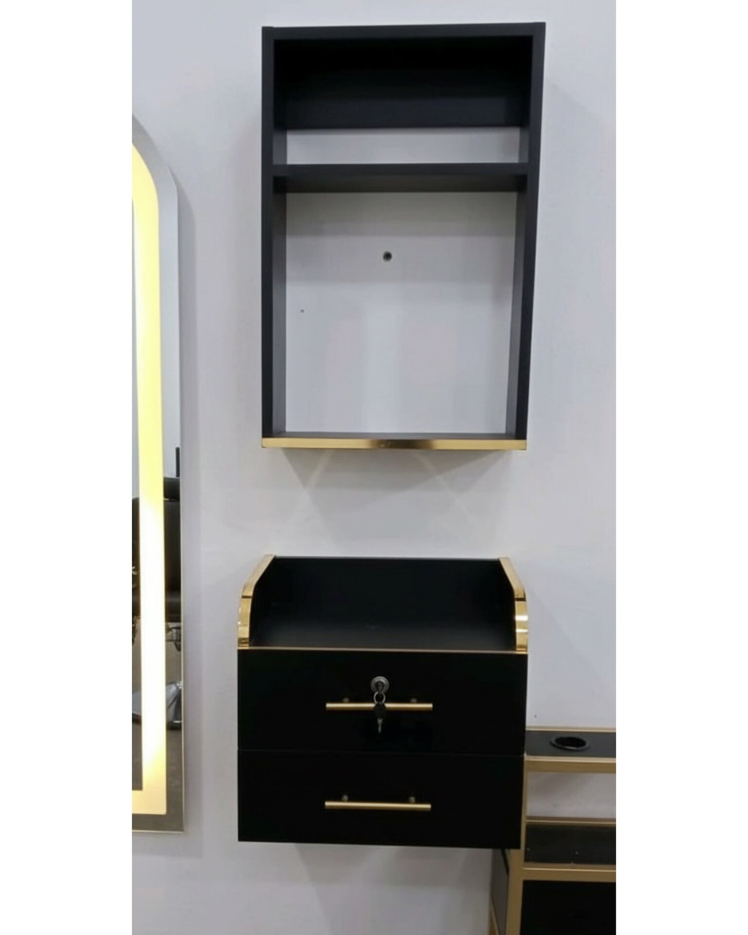 خزانة فاخرة مخصّصة لصالونات الحلاقة، مصممة لتمنحك تنظيم مثالي ومساحة عمل نظيفة وراقية. تأتي من قطعتين: خزانة علوية للتخزين وخزانة سفلية مع درجين ومفتاح للأدوات الثمينة. تصميم أسود مع لمسات ذهبية احترافية تعطي لمسة فاخرة لمكان العمل
