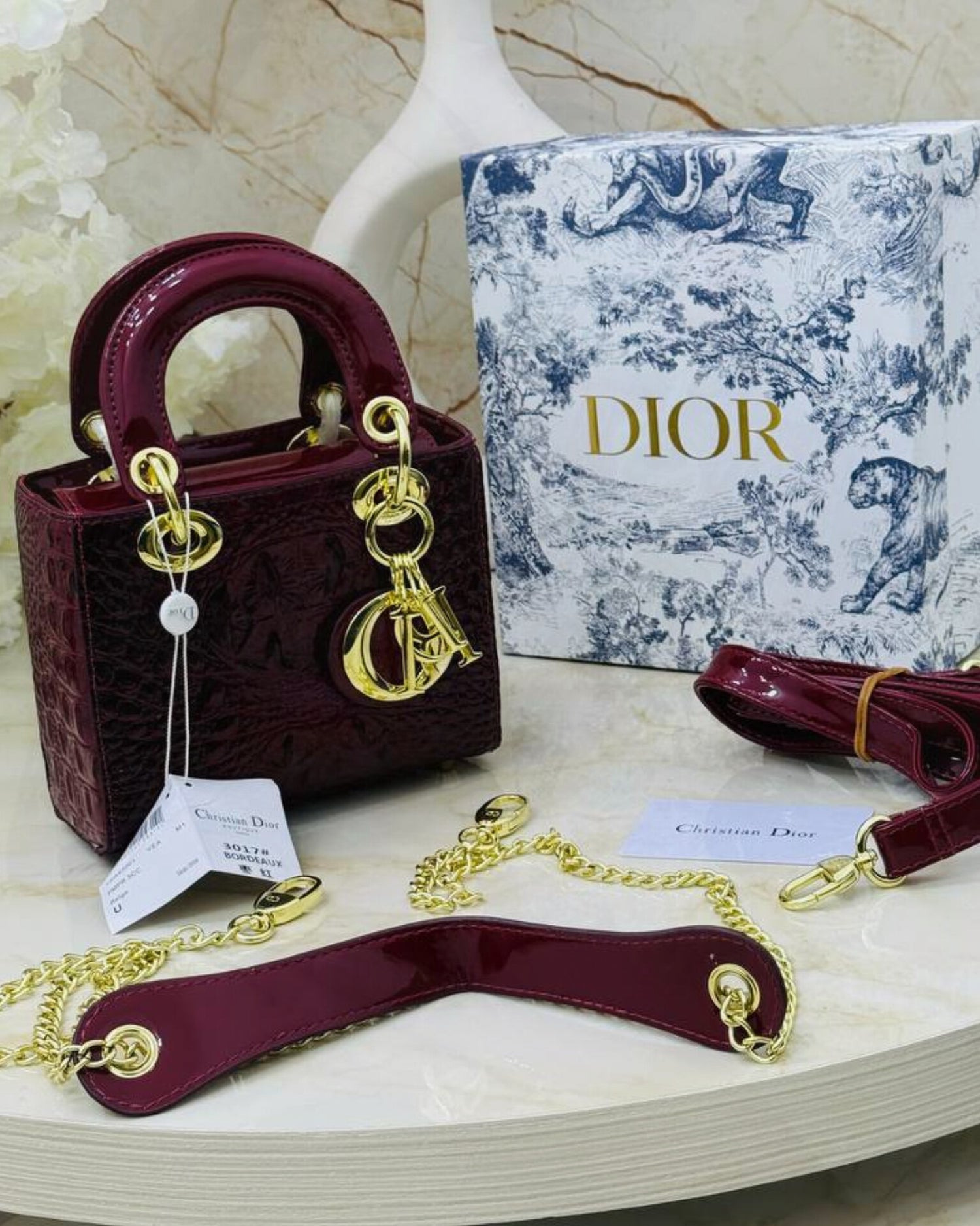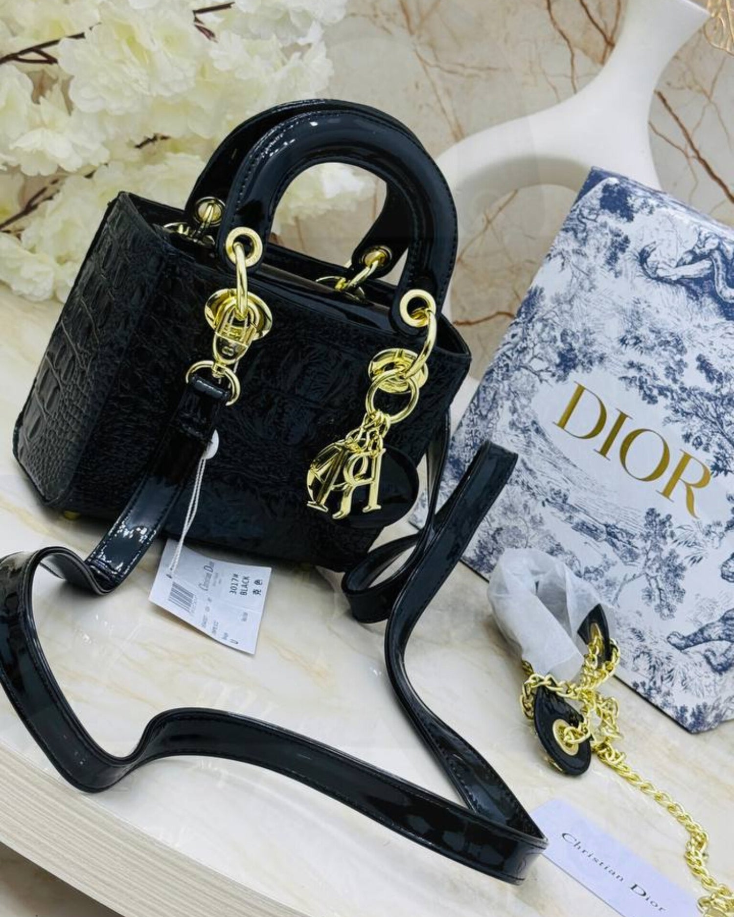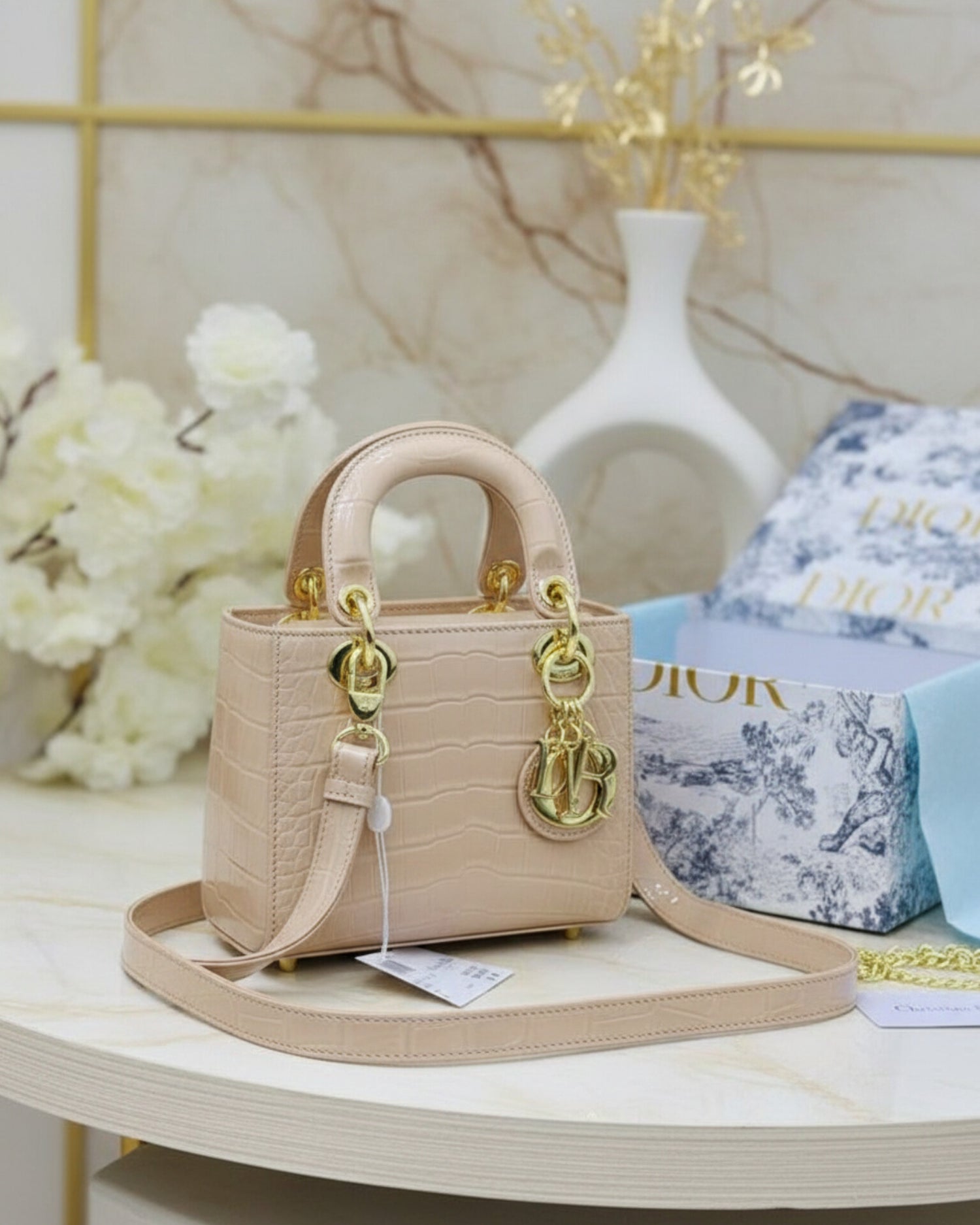 هذه الحقيبة الراقية من Dior صُمِّمت للمرأة التي تبحث عن الأناقة الحقيقية والجودة الموثوقة. مصنوعة من جلد تمساح صناعي متقن يمنحها مظهرًا فاخرًا ولمسة أنيقة تدوم
